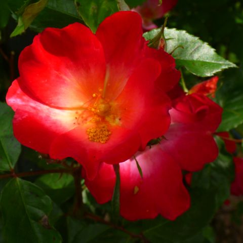 Fiore medio, semplice, a mazzi, colore rosso medio, che mostra stami gialli al centro, foglie scure e lucide, 40 x 60, rifiorenza continua, non profumata; può essere coltivata come ground cover (tappezzante).