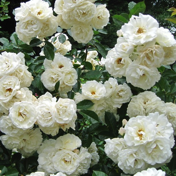 Fiore piccolo (2-3 cm.), doppio, a grappoli arrotondati lungo più di 1/3 del ramo, colore bianco, foglie verde scuro grigiastro, lanceolate, arbusto eretto poi ricadente, 100/150, rifiorente continua e abbondante, per ampi spazi o come esemplare isolato, buona resistenza alle malattie.