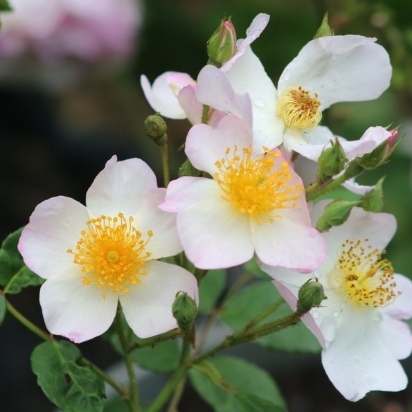 Fiore semplice, in enormi mazzi, colore bianco avorio con sfumature rosa, stami dorati, a forma di stella, foglie piccole, scure, un po' dentellate, lucide, rampicante, 900 x 450 (750 x 360), non rifiorente, intensamente profumata, poche spine, bacche decorative, per archi e pillar, tollera terreni poveri, la mezz'ombra e muri rivolti a nord.