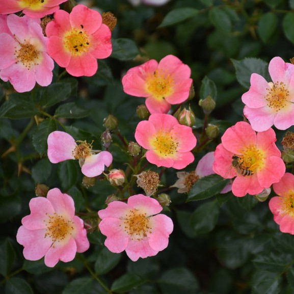 Fiore piccolo (3-4 cm.) semplice, a grappoli piramidali, colore rosa scuro, sfumato bianco al centro, rovescio più chiaro, foglie medie, scure, semi-lucide, eretto e leggermente svasato, 125/150, rifiorenza continua e abbondante, profumo leggero, bacche decorative, poche spine, per ampi spazi o come esemplare isolato, resistente alle malattie.