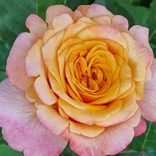 Fiore grande, doppio, inizialmente a urna poi a coppa aperta , colore albicocca chiaro che sfuma al rosa, fioritura abbondante.
