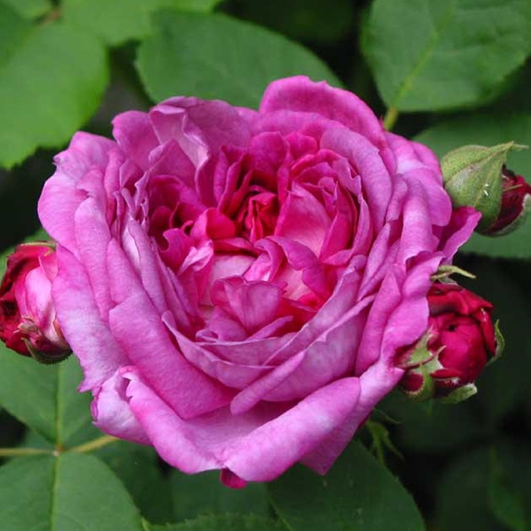 Fiore grande, doppio, petali centr. mossi, a mazzi, colore cremisi scuro, rovescio rosa-lilla, foglie scure, arbusto alto, necessita di sostegno, 180 x 180, non rifiorente, intensamente profumata, molte spine, boccioli rivestiti di muschio, tollera terreni poveri, può essere coltivata anche in grandi vasi.